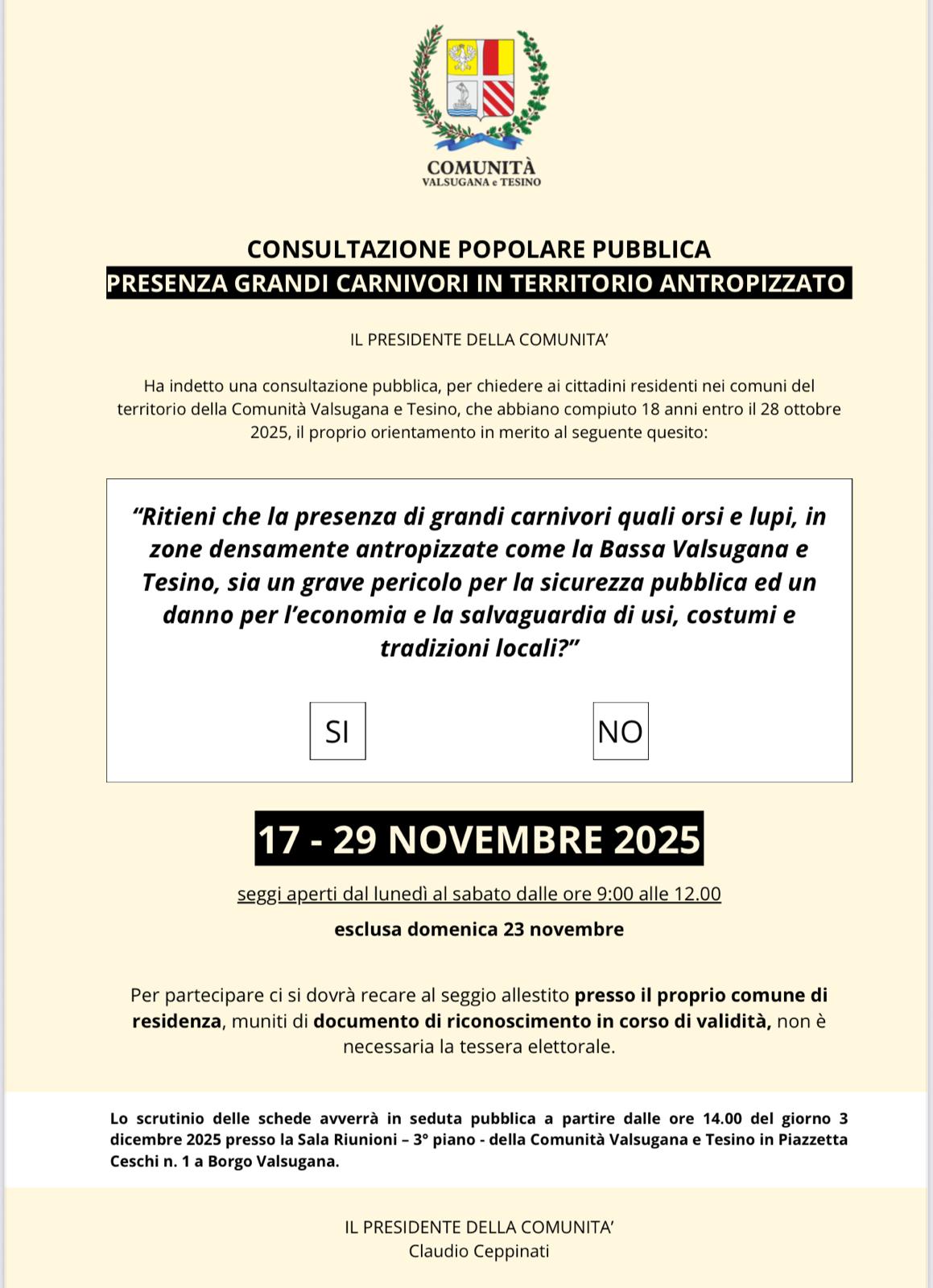 Si informa la cittadinanza (Residenti maggiorenni alla data del 28.10.2025) che la Comunità di Valle ha indetto una consultazione pubblica per dare la possibilità di esprimere la propria opinione in merito ai grandi carnivori.