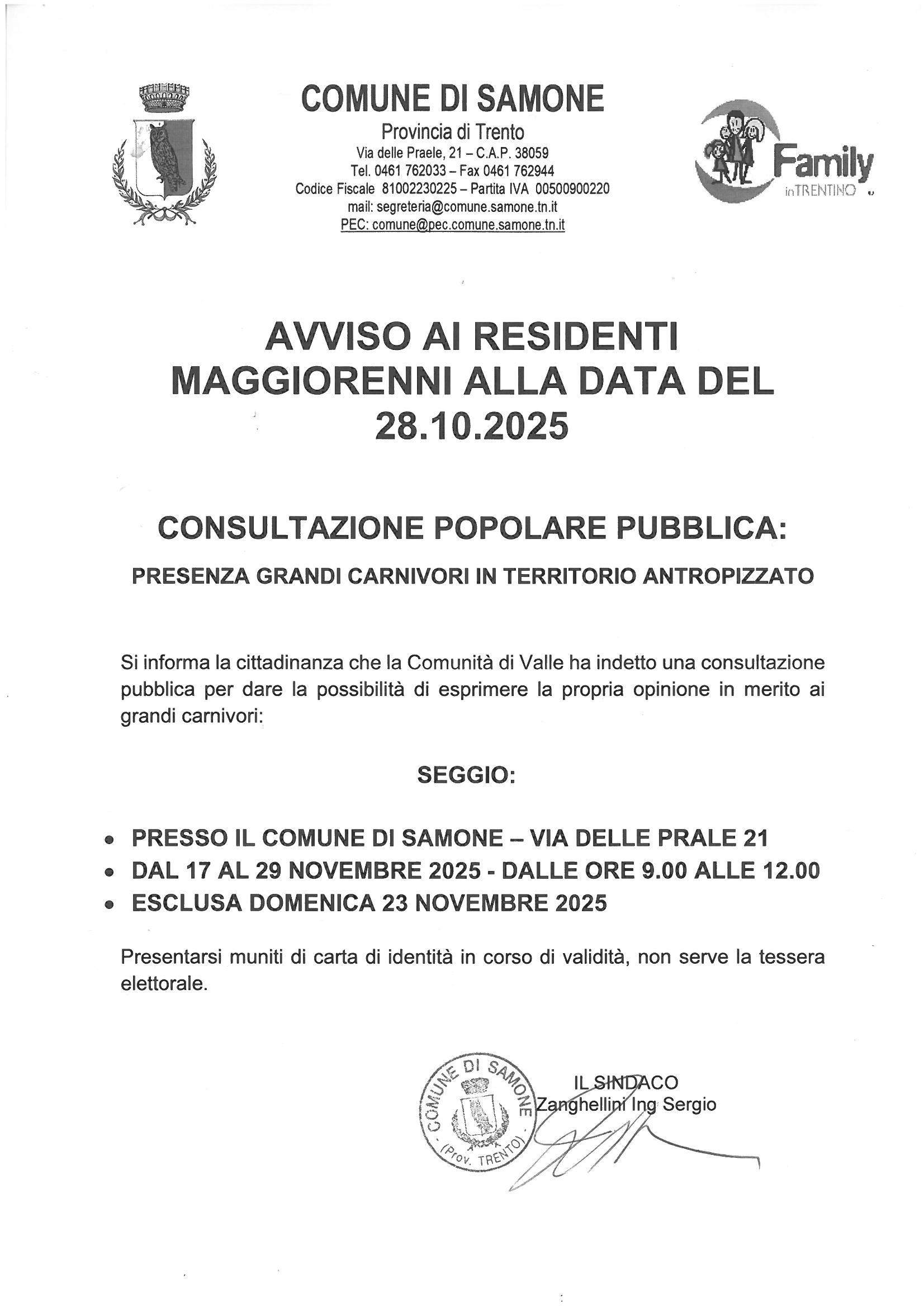 La consultazione si terrà presso gli uffici comunali di Samone (per i residenti a Samone) in via delle Praele 21 - dal giorno 17 al 29 novembre 2025 dalle ore 9.00 alle ore 12.00 esclusa la domenica.